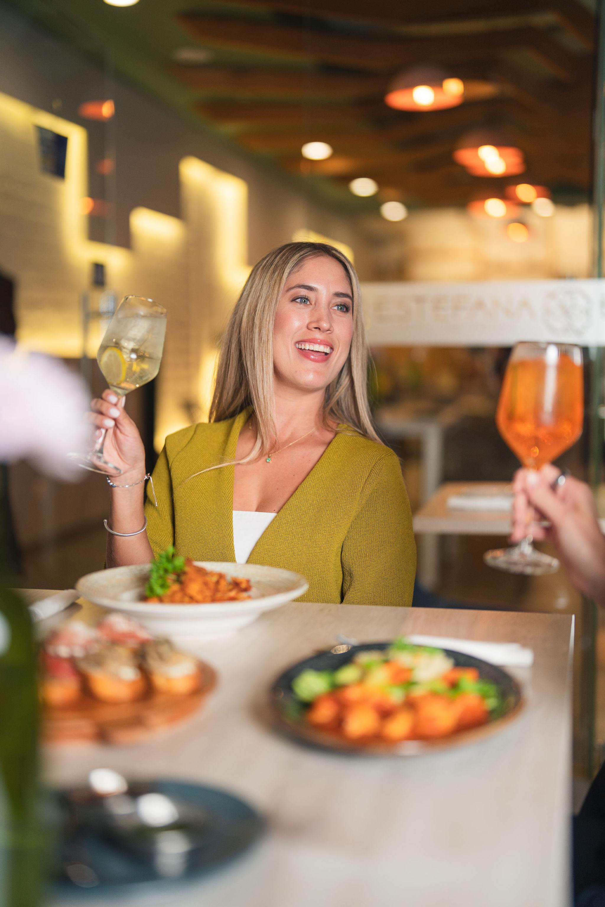 Nuestra única y tradicional lasagna de Estefana, con finas capas de pasta fresca, salsa boloñesa, queso crema y queso cheddar, sobre un espejo de salsa de tomate y coronado con queso parmigiano reggiano, acompañado con ensalada de la casa.