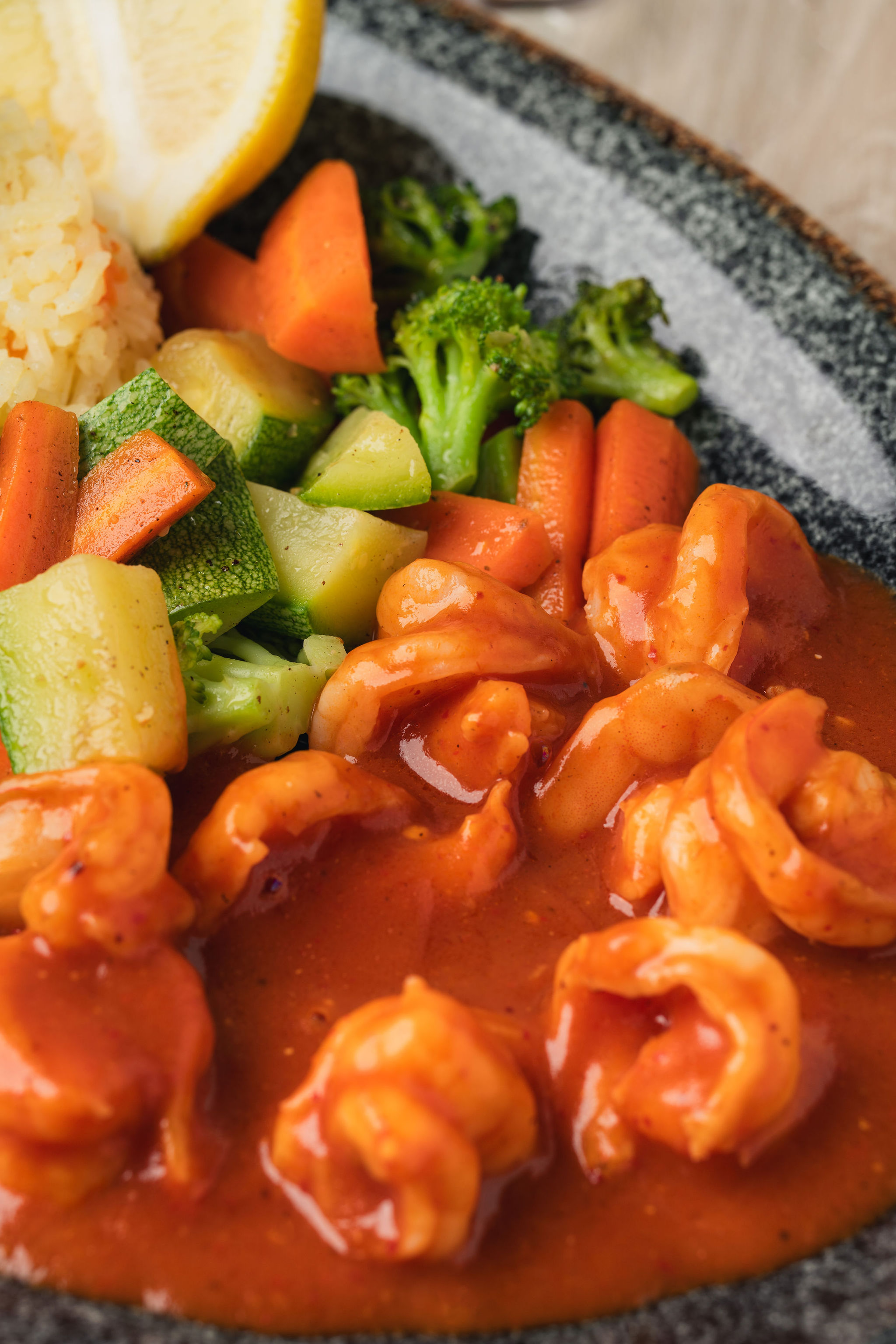 Nuestra versión de camarones a la diabla, como los hacía la abuela, acompañados de arroz y verduras a la mantequilla.