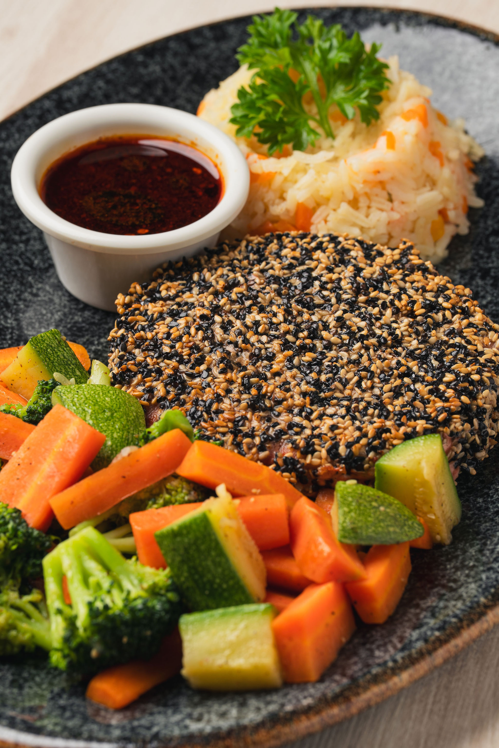 Atún empanizado en costra de sésamo, acompañado con nuestra emblemática salsa Magui, arroz y verduras salteadas.