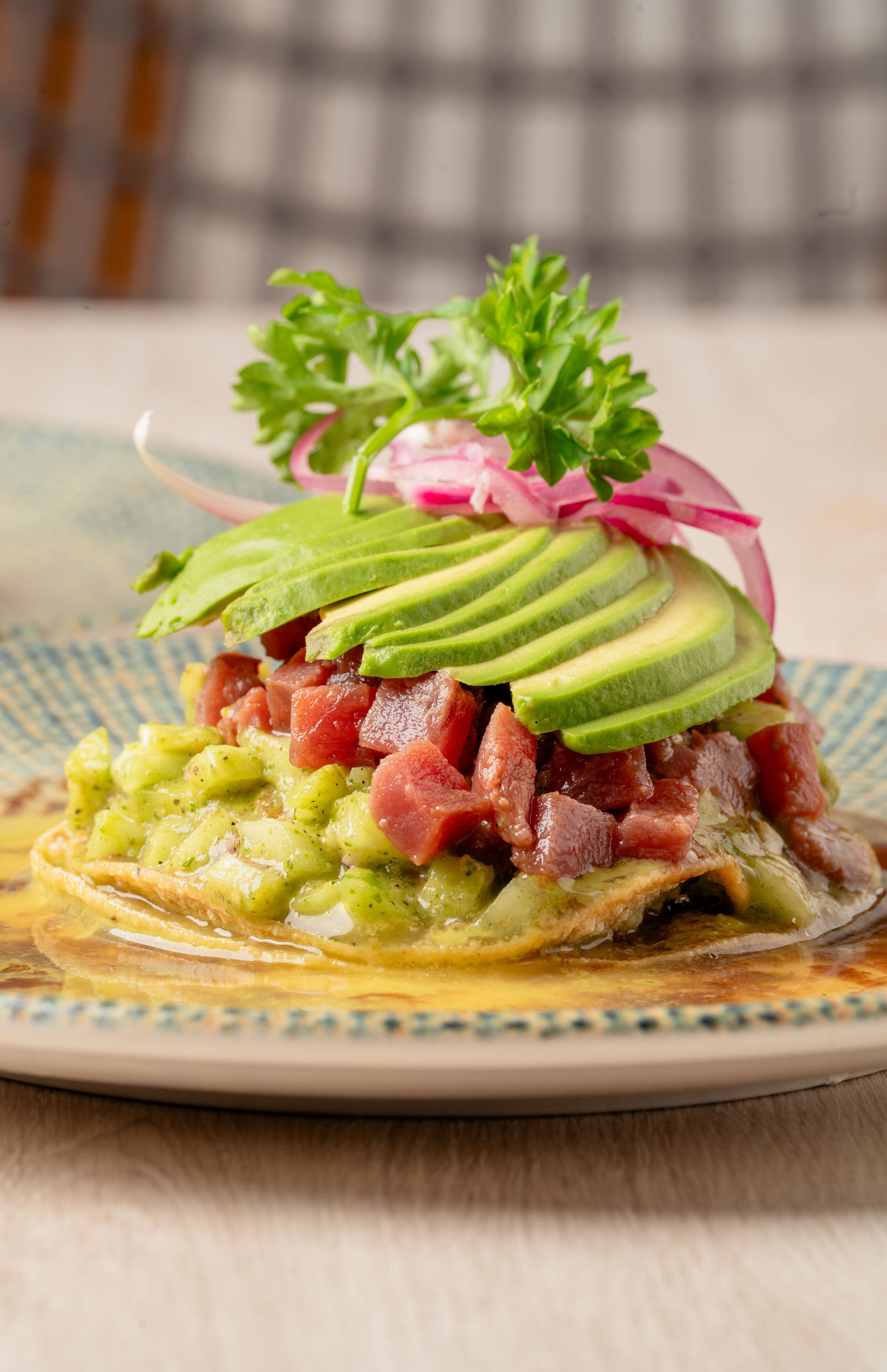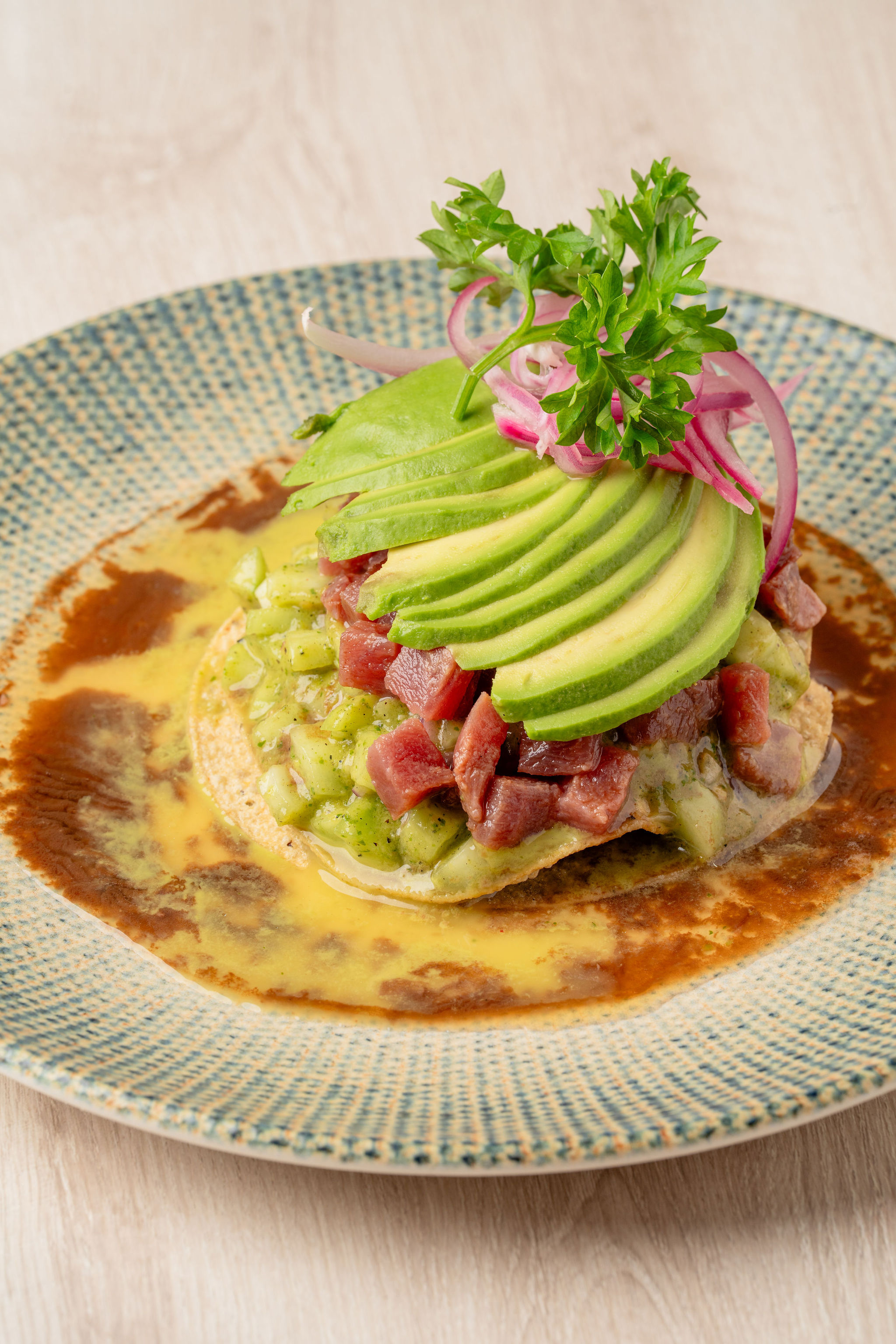 Montada sobre base de pepino picado y aderezo hecho en casa de chile cuaresmeño asado, seguido de atún curtido y coronado con aguacate.
