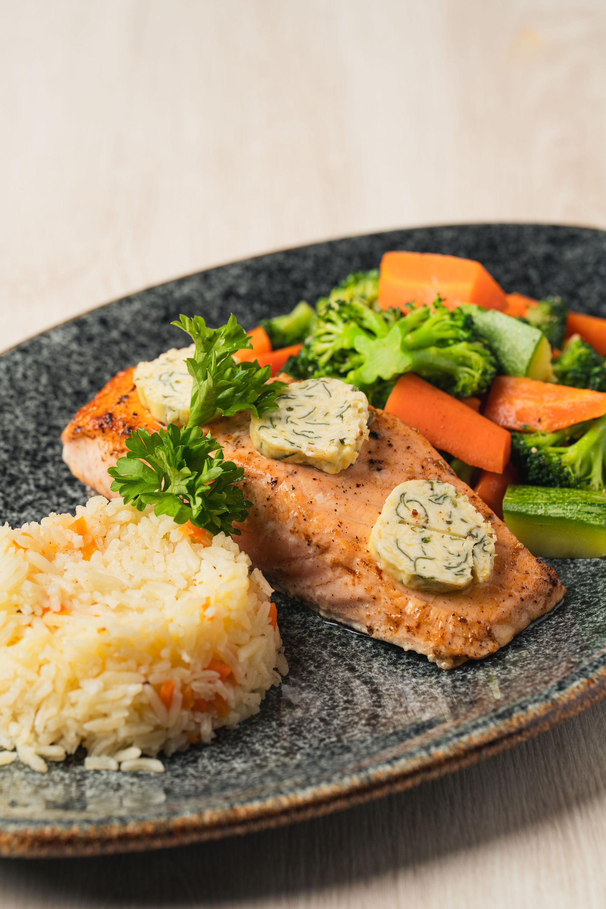 Salmón a la mantequilla, sazonado con toques de limón amarillo y perejil, coronado con una salsa maitre d’hotel, acompañado de arroz y verduras salteadas.