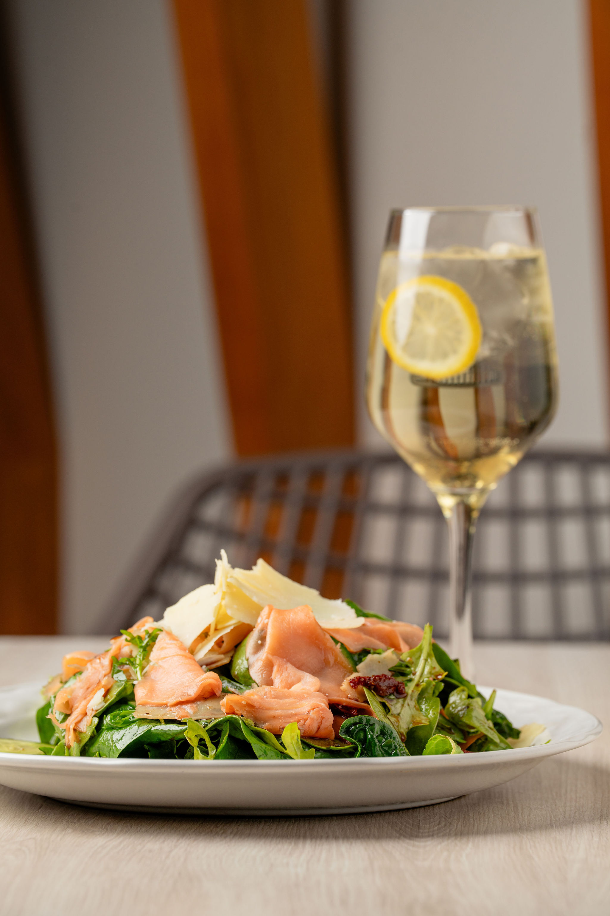 Base espinaca, arúgula, jitomate deshidratado, queso parmesano y salmón ahumado, aderezada con balsámico.